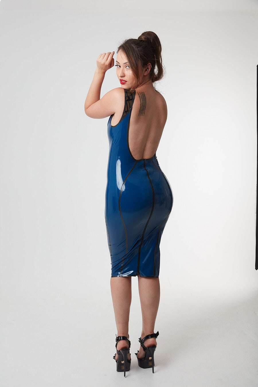 This Low Back dress is a V-neck style dress with laser-cut shoulder detail, giving a subtle pin-up style neckline when the block-colour latex is introduced. The contrasting strip binding highlights and exaggerates the curves of the female silhouette.
