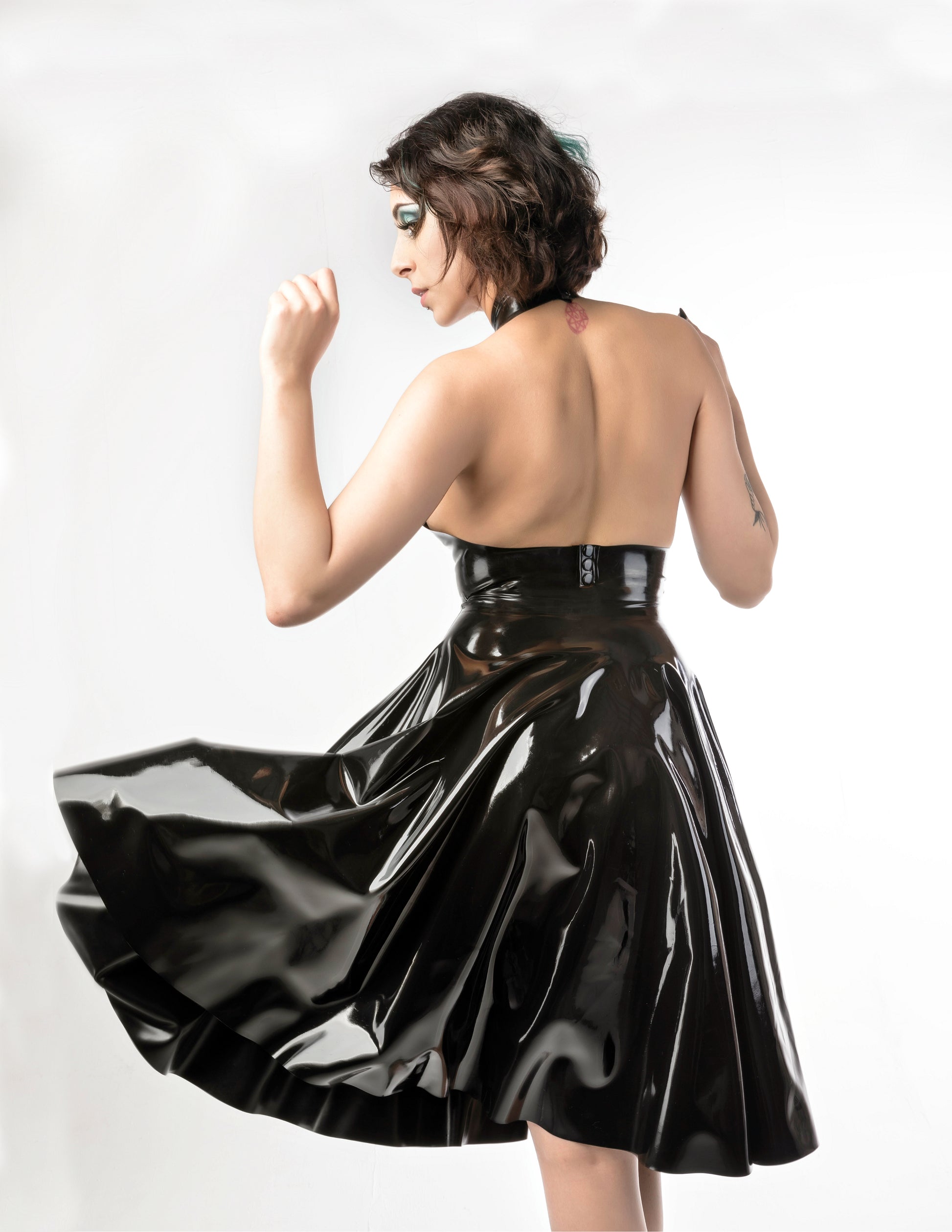 The Back to Basics Circle Skirt is made up of two circular sheets of latex. The only attachment is a waistband to enhance the waist. There are two side seams, the natural fall and volume creates a free flowing so a super slick shine never ends when you give it a spin. A beautiful and elegant staple piece that can be dressed up or down, a timeless classic.